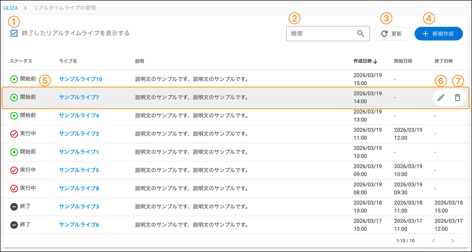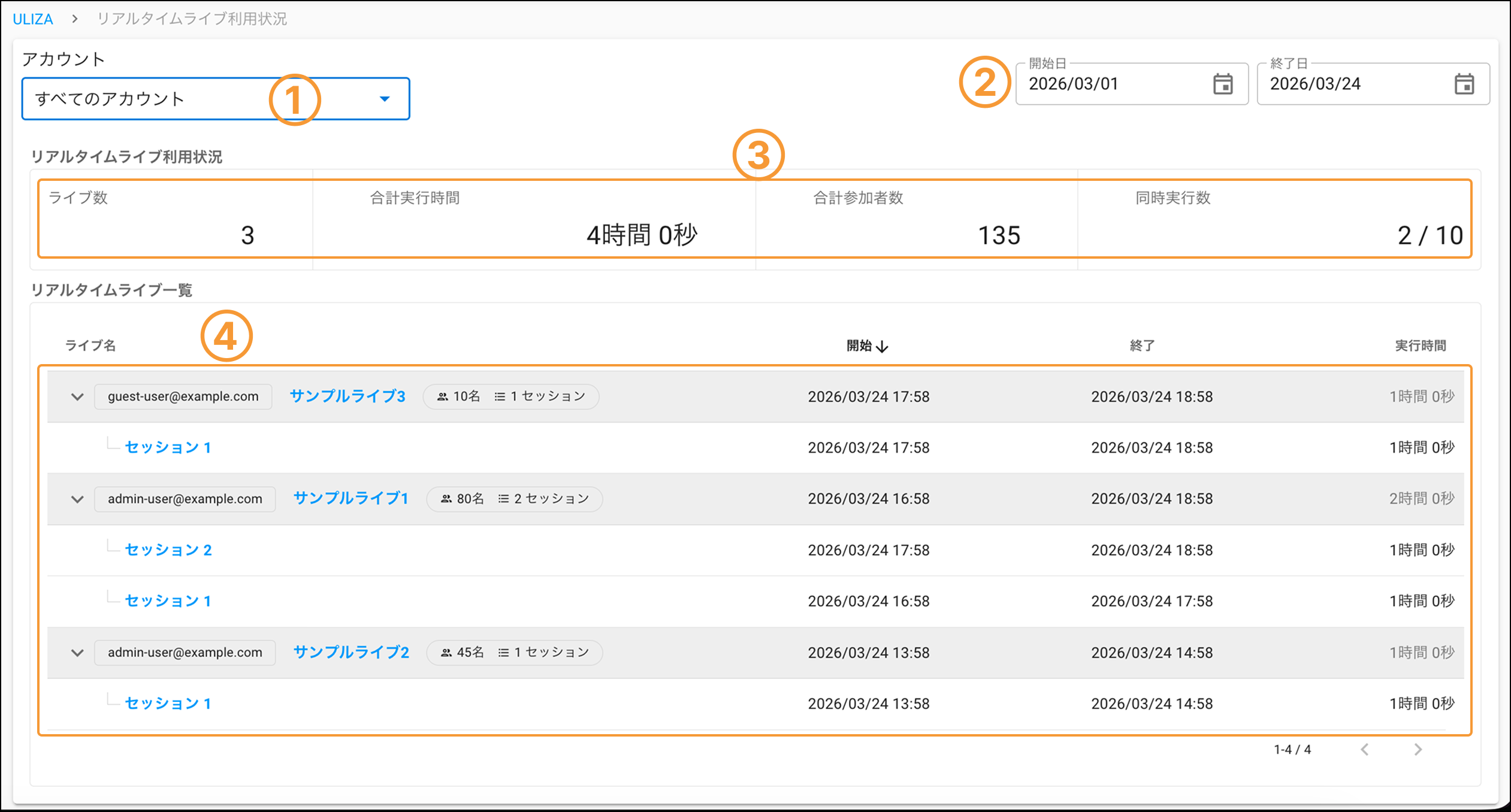 - ④ ライブ一覧 ①②で指定した範囲のリアルタイムライブの一覧が表示されます。 リンクをクリックするとリアルタイムライブの詳細画面に遷移します。