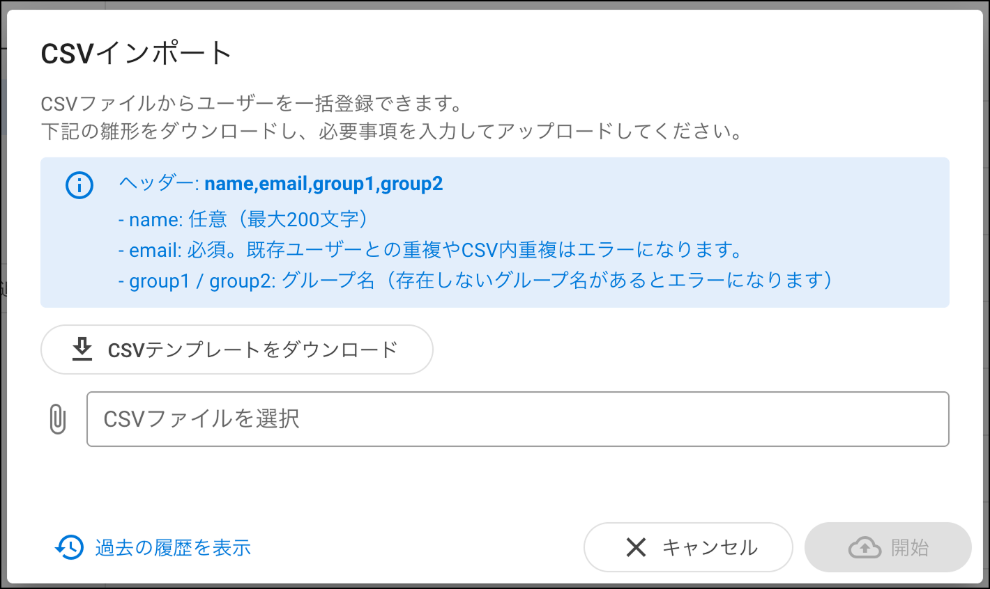 - CSVファイルの選択と「開始」ボタンによる一括登録