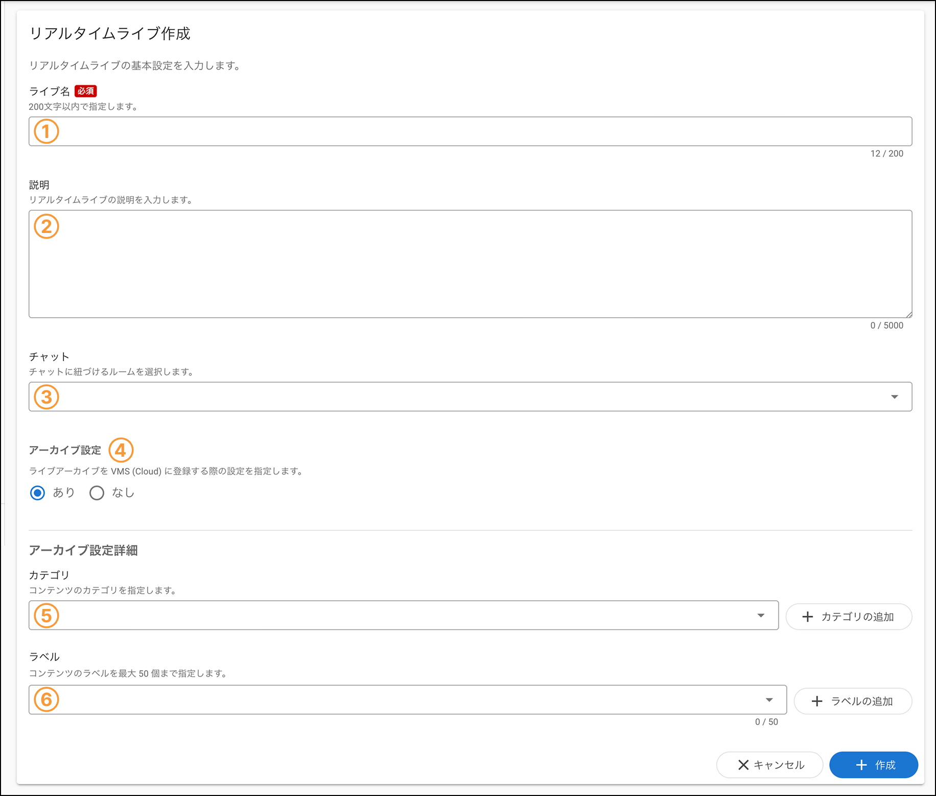リアルタイムライブの作成画面および編集画面の構成は以下の通りです。