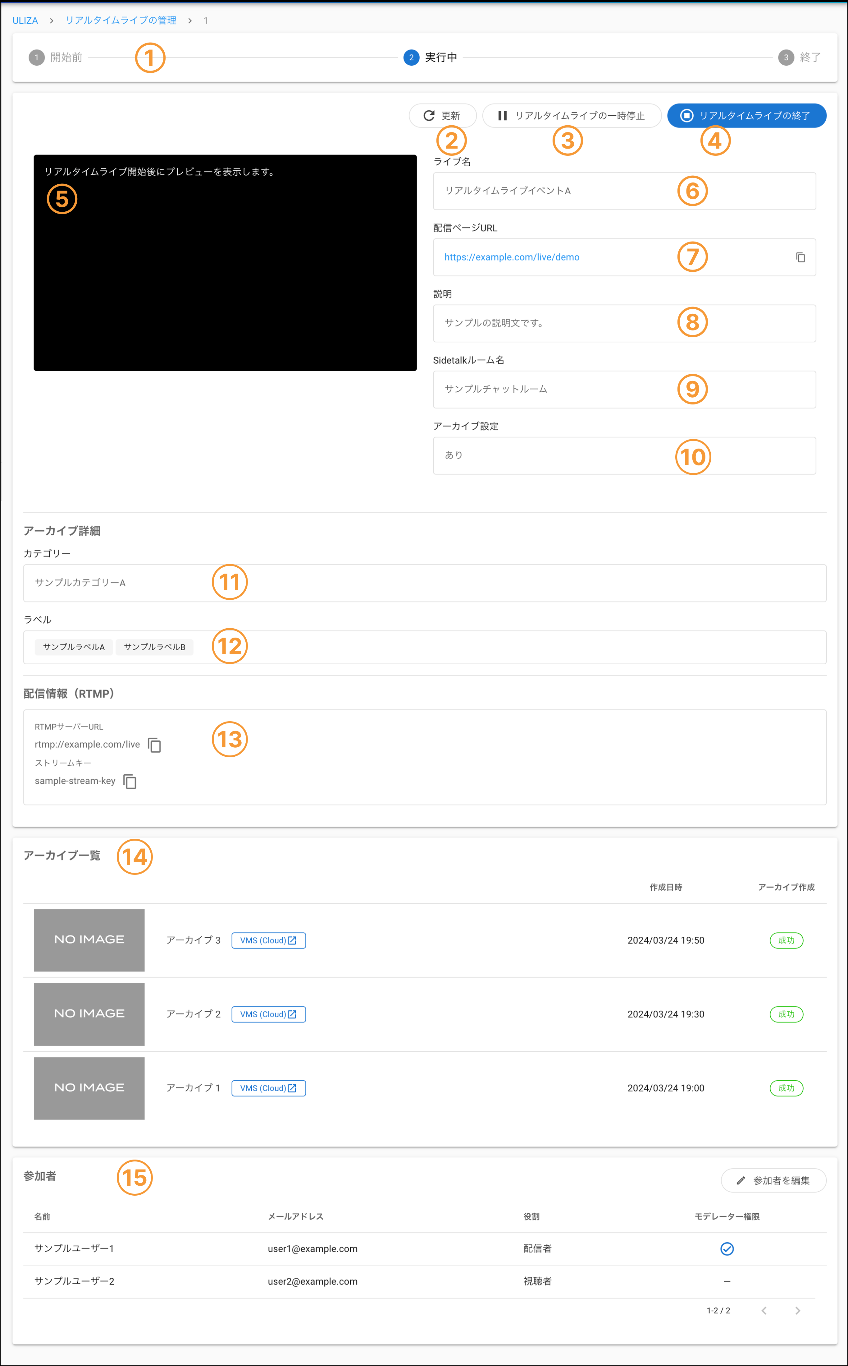リアルタイムライブの詳細画面の構成は以下の通りです。ライブのステータス確認や配信操作が行えます。