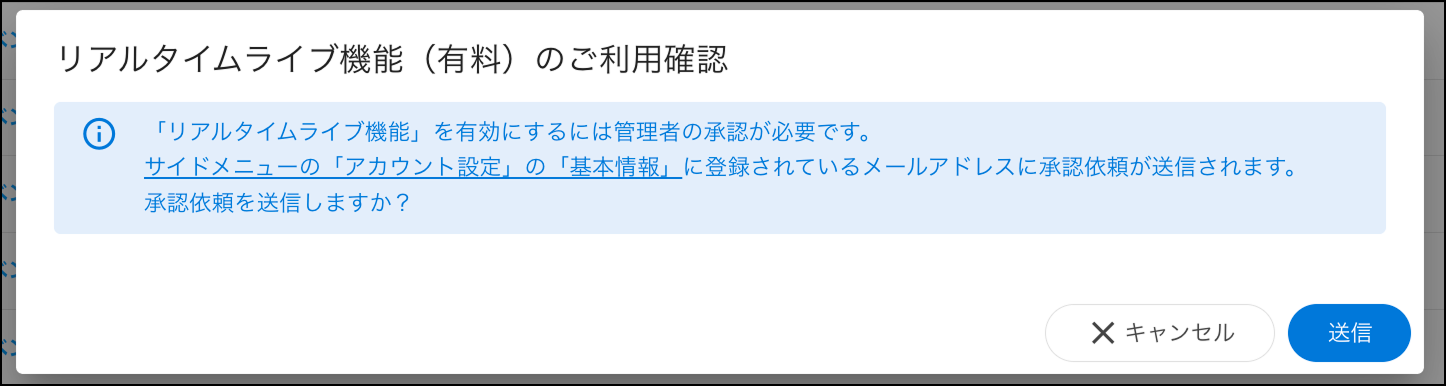 クリックすると「リアルタイムライブの削除」ダイアログが表示されます。「削除」ボタンをクリックすると、選択したリアルタイムライブが削除されます。 ※ ライブの状態が開始前の場合のみ操作可能です。