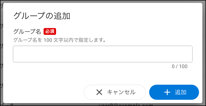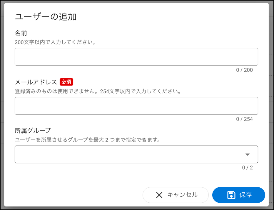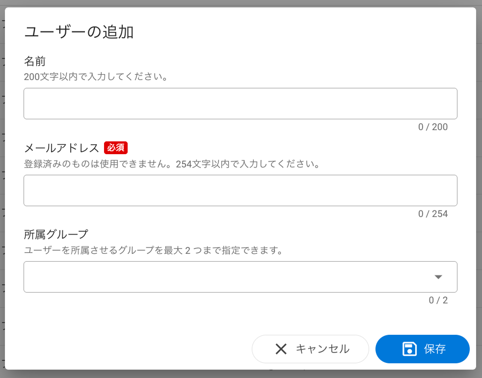 このボタンをクリックすると「ユーザーの追加」ダイアログが表示されます。名前やメールアドレス、所属グループを設定してユーザーを作成できます。