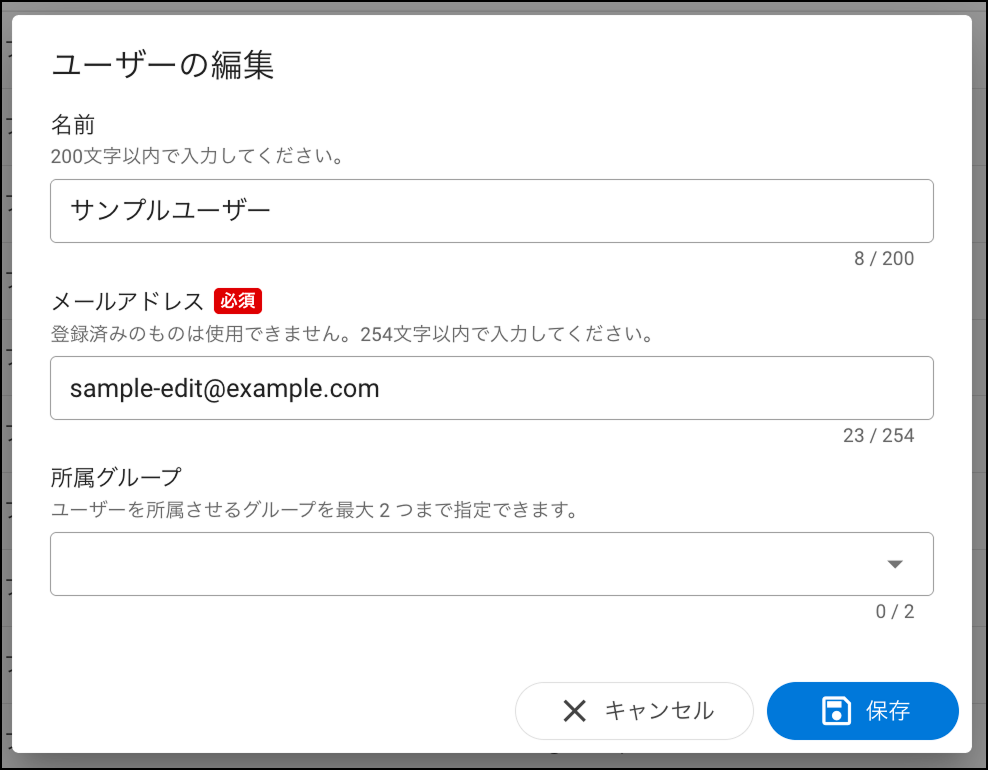 クリックすると「ユーザーの編集」ダイアログが表示されます。名前やメールアドレス、所属グループを変更して内容を更新できます。