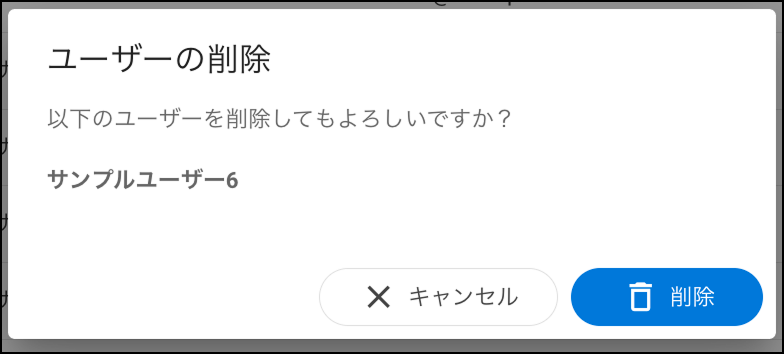 クリックすると「ユーザーの削除」ダイアログが表示されます。「削除」ボタンをクリックすると、選択したユーザーが削除されます。