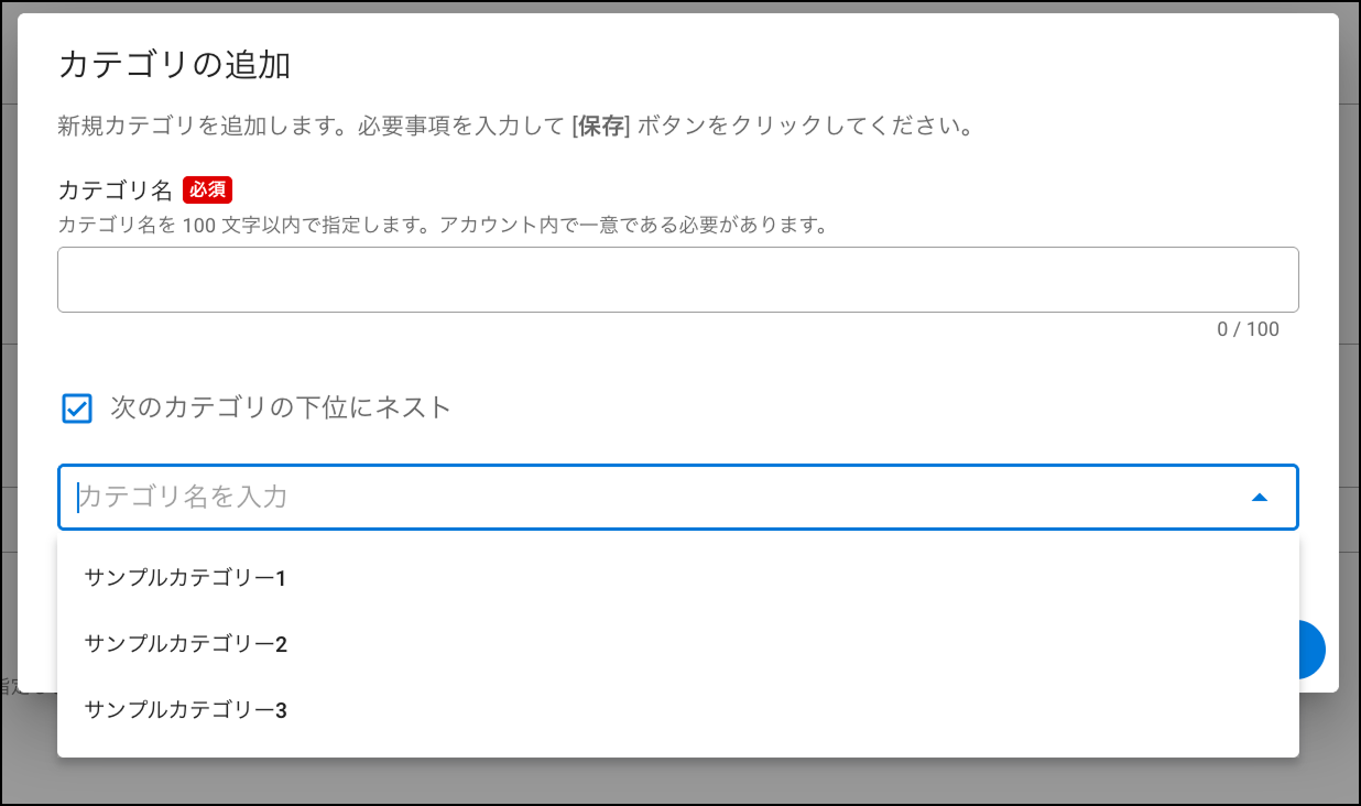 - ⑤ カテゴリ アーカイブのカテゴリを設定できます。 「カテゴリの追加」ボタンをクリックするとダイアログが表示され、新規作成できます。カテゴリは階層構造で設定することも可能です。