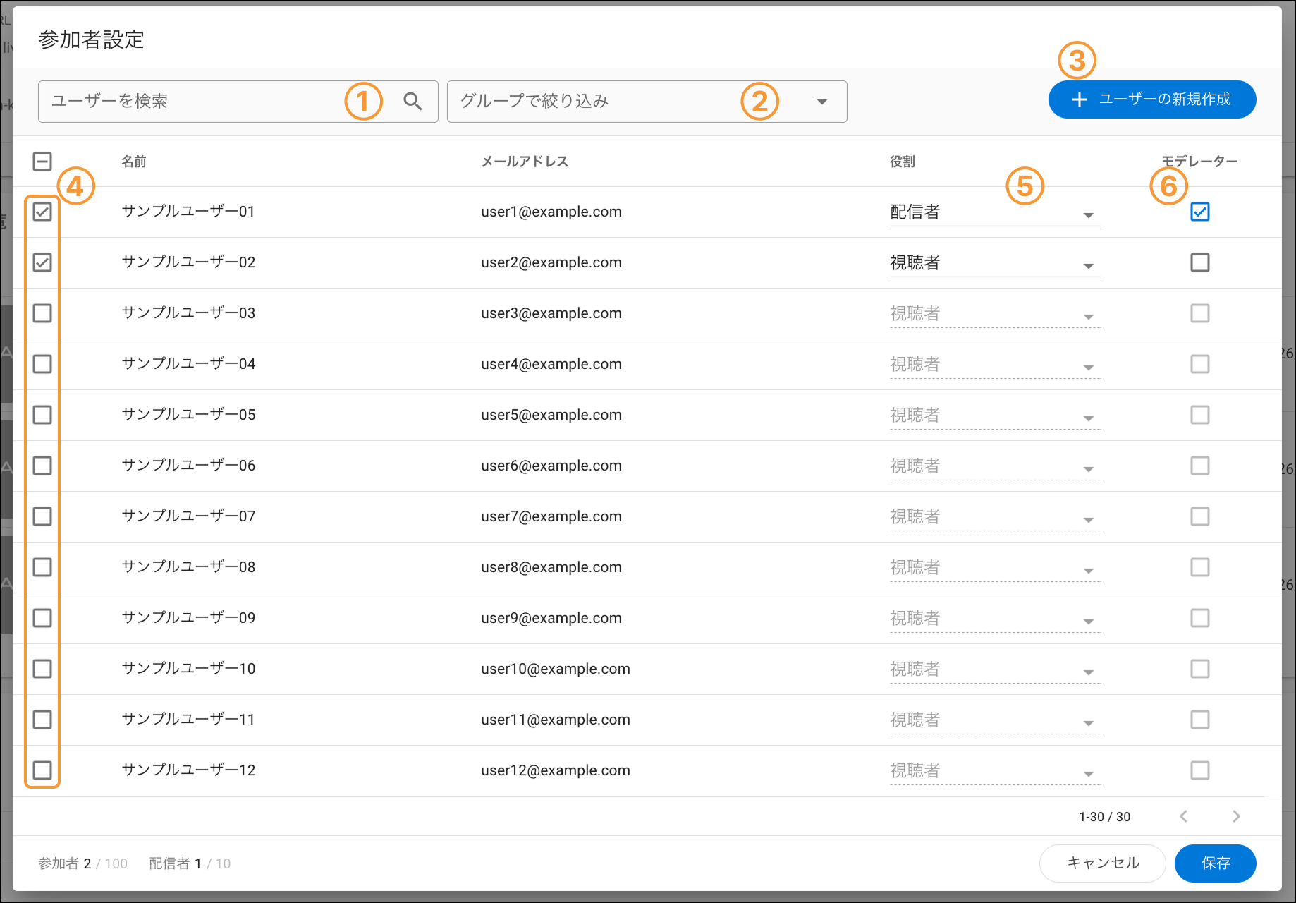 - ⑮ 参加者 「参加者を編集」ボタンをクリックすると、参加者設定ダイアログが表示されます。参加者の設定およびユーザーの新規作成が可能です。