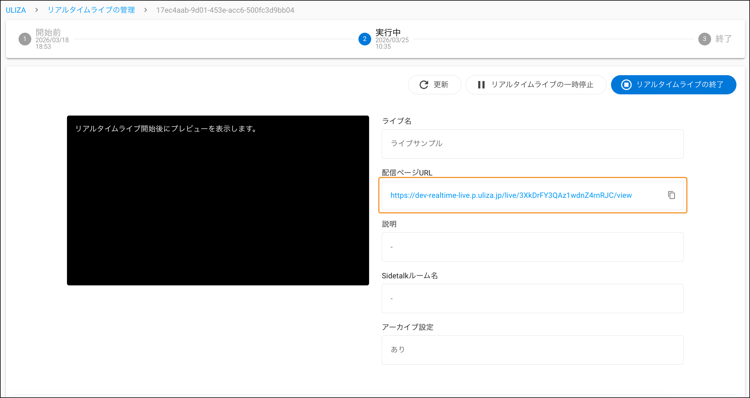 | 実行中 | ライブが実行中である状態です。 この状態で配信ソフトを接続することでライブ配信ができます。 「更新」操作を行うと、ページの表示内容が更新されます。「一時停止」操作を行うと「開始前」ステータスに変化します。 「終了」操作を行うと「終了後」ステータスに変化します。 | 更新、一時停止、終了 |