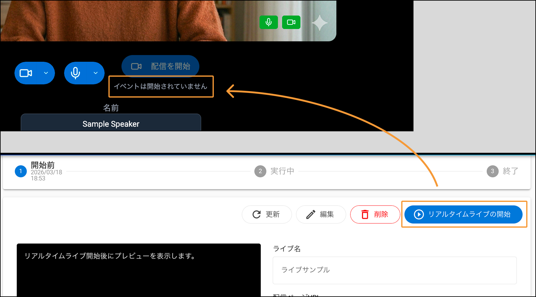 「管理画面から配信」を選択すると、ライブイベントが起動した後配信ページに移動します。配信ページでは、ウェブカメラを使用したストリーミング配信を行うことができます。