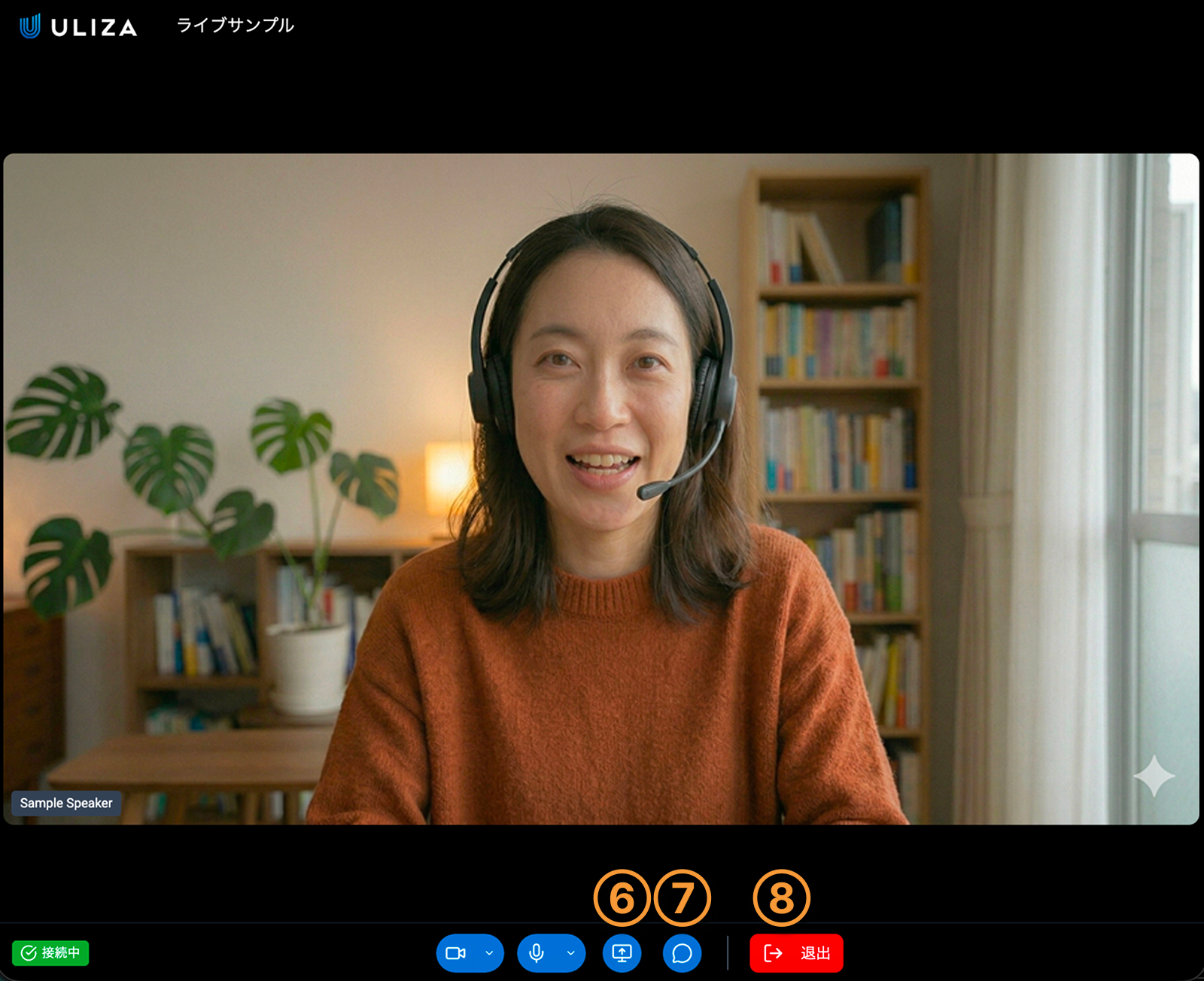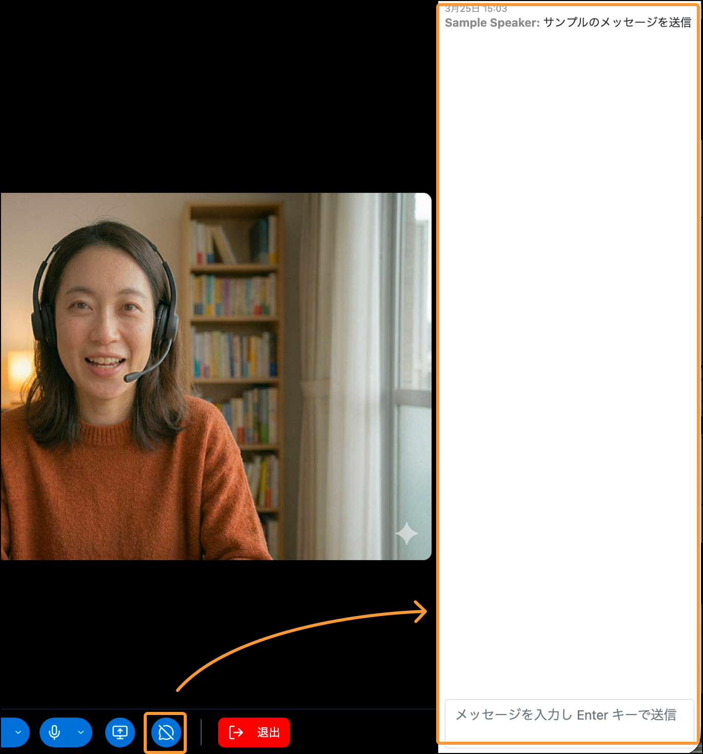 ⑦ 「チャットルームを開く」ボタン Sidetalkがリアルタイムライブに設定されている場合に使用可能です。 再度クリックするとチャットのサイドバーを閉じることができます。