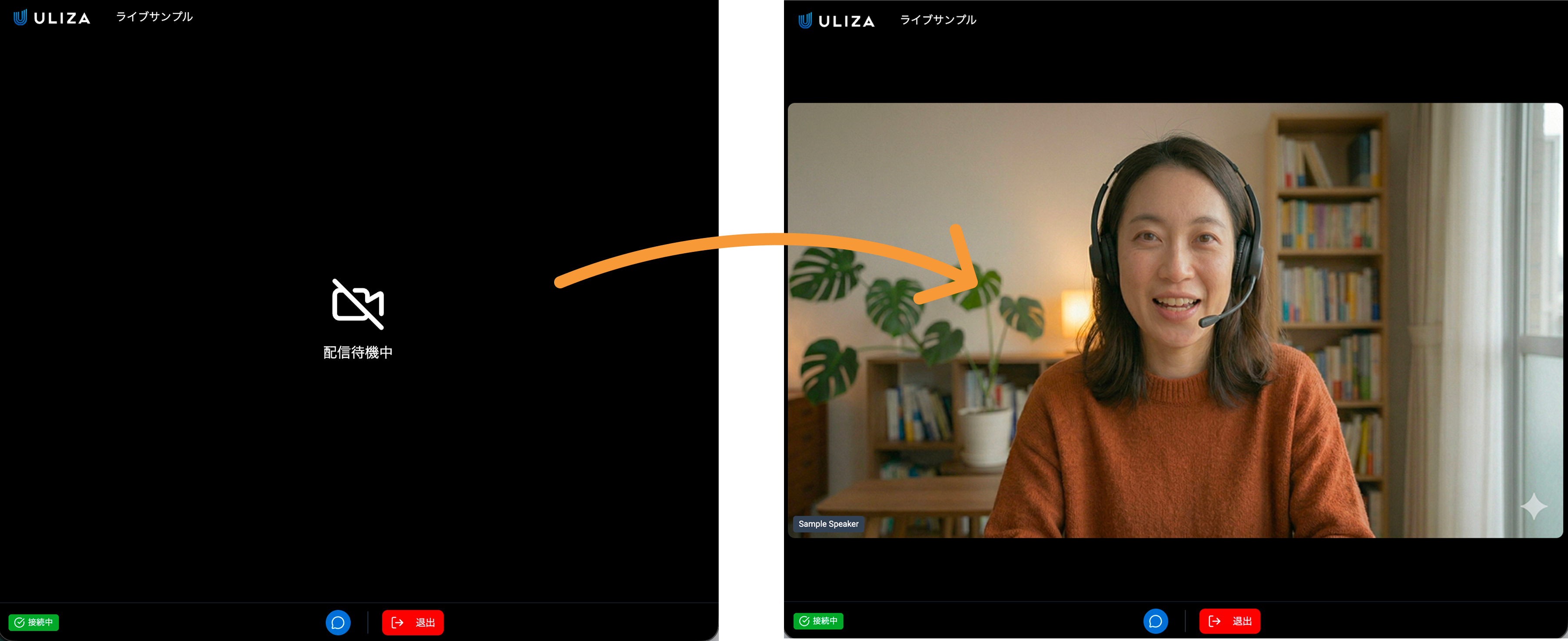 「参加する」ボタンをクリックすると、配信画面が表示されます。 配信が開始されると、画面にライブ映像が表示されます。