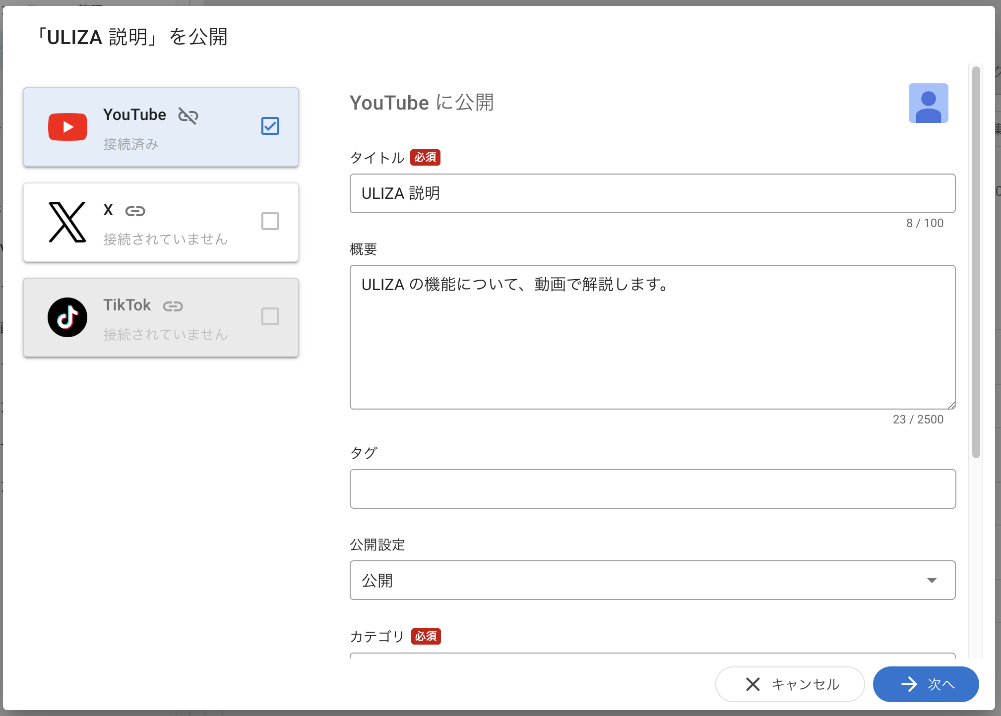 | コンテンツ | ULIZA VMS (Cloud)がタイトルやカテゴリなどのメタデータを管理する基本的な単位を指します。 |