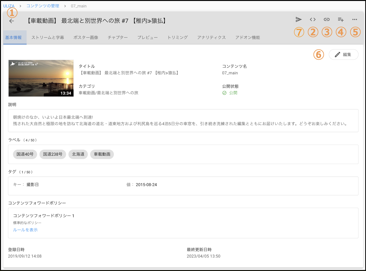 「基本情報」タブではコンテンツの基本情報を確認および編集することができます。「基本情報」タブの構成は以下の通りです。