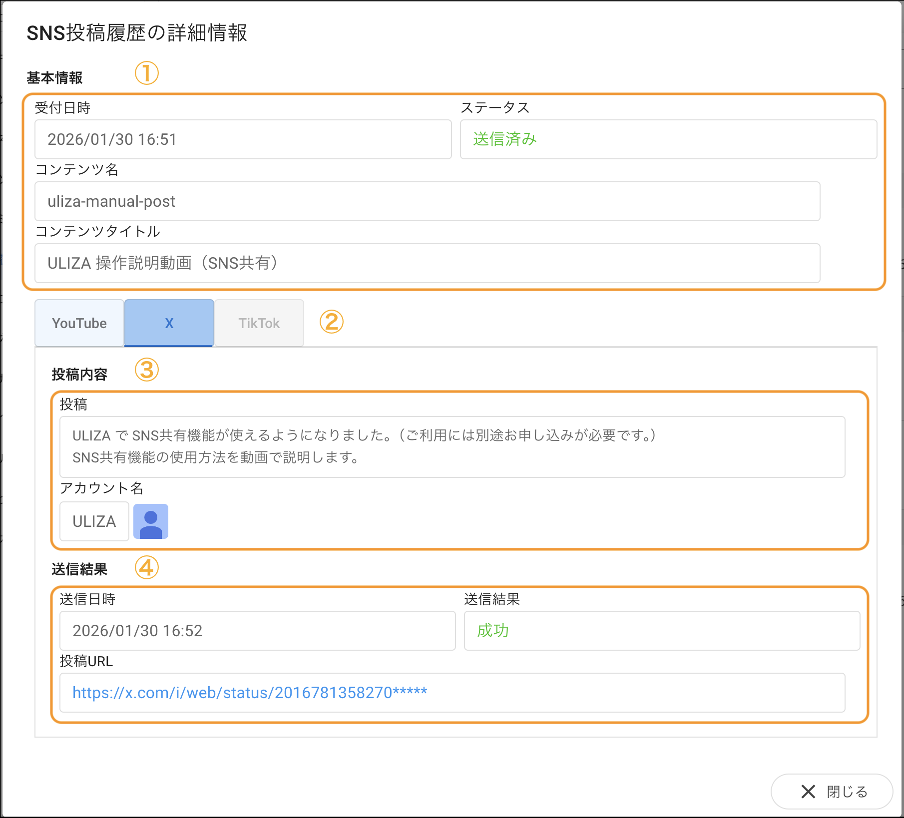 このボタンをクリックすると「SNS共有」ダイアログが表示され、SNSを選択して動画を公開できます。各SNSへの投稿内容を入力して、「公開する」ボタンをクリックすると、選択したSNSへ動画が公開されます。