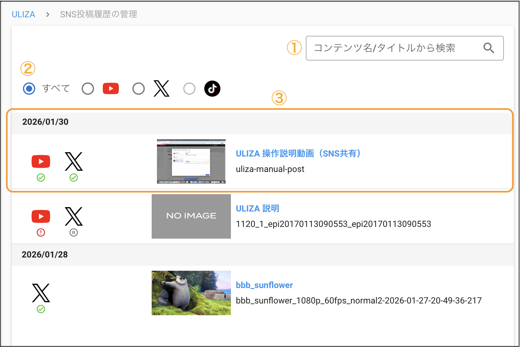 ここにキーワードを入力すると、そのキーワードをコンテンツ名、タイトルまたは説明に含むコンテンツのみがコンテンツリストに表示されます。