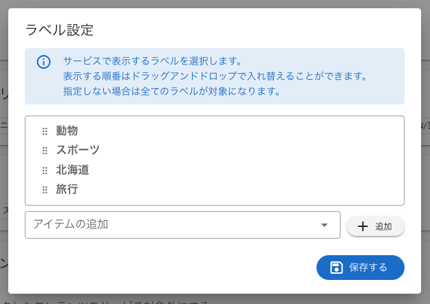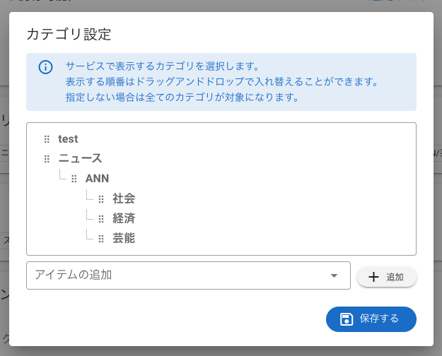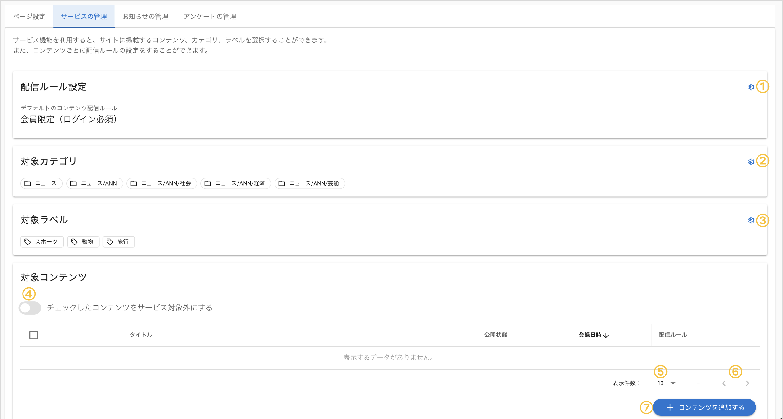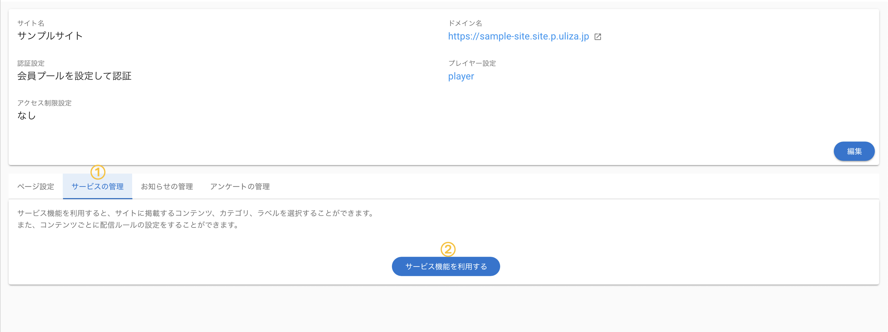 サイトのサービス機能を有効にすることで、サイトに掲載するコンテンツ、カテゴリ、ラベルを制限することができます。